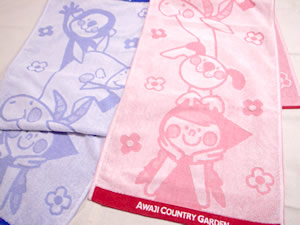 35×100cm、バスタオルにも使えるスポーツタオルです。カントリーちゃん、ハナちゃん、ヤギさん、ロバさん、おサルのイラストが入っています。あかとあおの2色です。