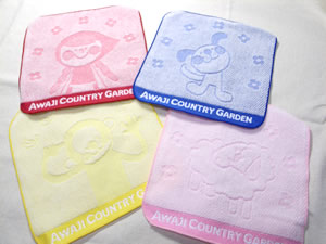 20×20cmの使いやすいタオルハンカチです。あか・カントリーちゃん、あお・ハナちゃん、きいろ・おサル、ピンク・ヒツジさんです。